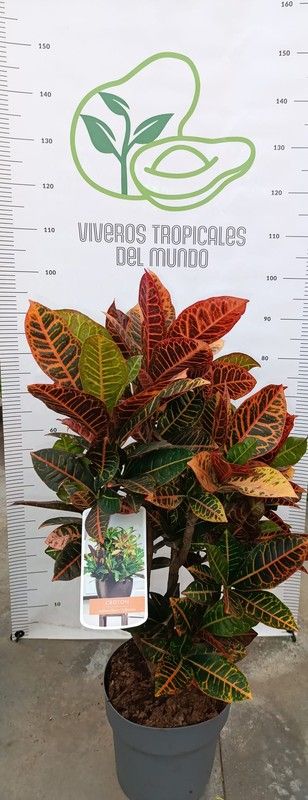 Descripción: El Codiaeum Variegatum, más conocido como crotón, es un arbusto perenne originario de regiones tropicales del sudeste asiático y perteneciente a la familia Euphorbiaceae (Euforbiáceas). En estado silvestre, puede convertirse en un arbusto o mini árbol de varios metros de altura.La diversidad de colores y formas de las hojas que posee lo ha convertido en una planta ornamental muy popular. Aunque esta planta tropical se cultiva principalmente como planta de interior en España, en las zonas más cálidas, especialmente en las costeras como Canarias, puede crecer perfectamente en exteriores. Riego: Hay que regar la planta con regularidad pero a dosis pequeñas. Comprobamos entre riego y riego que los primeros 5 cm del sustrato están secos. En invierno, necesitará agua cada 10-15 días. En verano, cada 3-4 días. Abono: Aplicar cada 15 días un poco de abono fertilizante líquido.